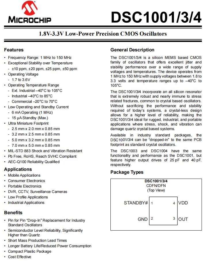| DSC1003CI5-020.0000 | Microchip晶振 | DSC1003 | 20MHz | 1.8 ~ 3.3V |