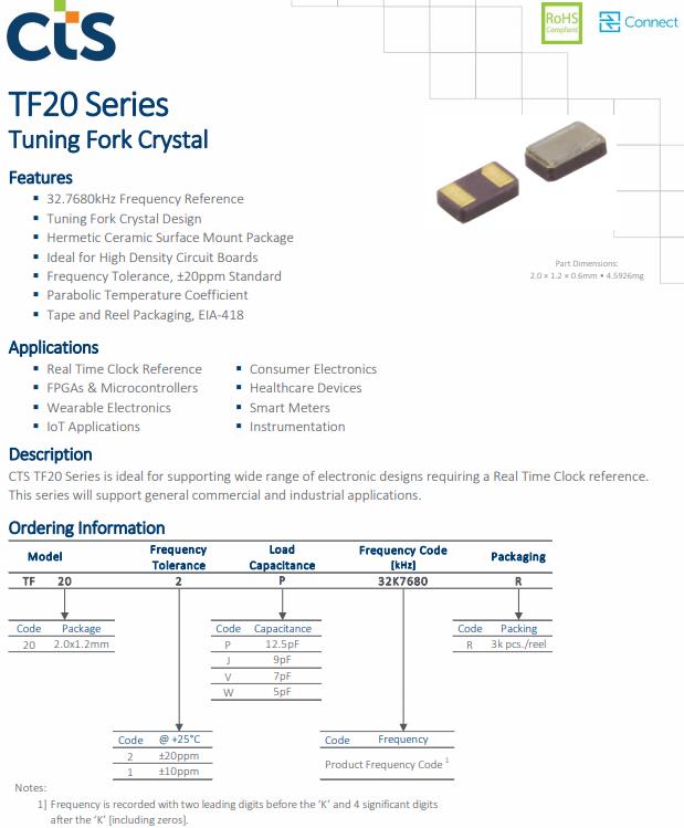 CTS TF20系列非常适合支持各种需要实时时钟参考的电子设计。这个系列将支持一般的商业和工业应用。