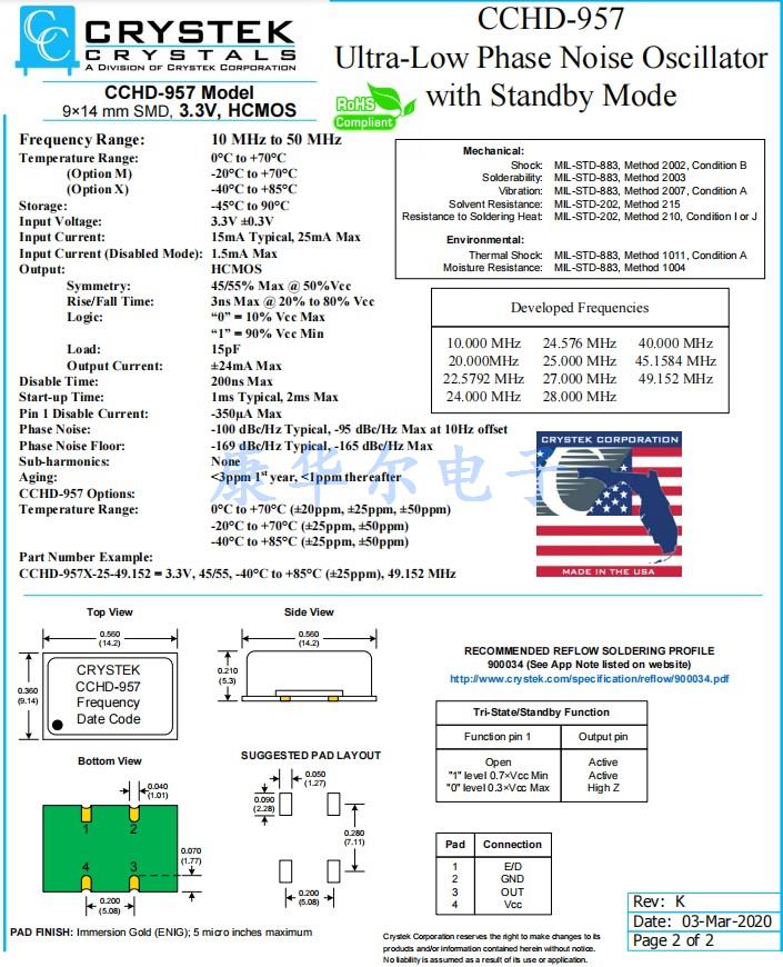 进口瑞斯克晶振,CCHD-957高清音频专用晶振,CCHD-957X-25-49.152晶振,Crystek的CCHD-957 HCMOS时钟晶体振荡器系列专为高清晰度音频(HD音频)而设计。它的典型低近载波相位噪声为-100 dBc/Hz(10Hz失调),本底噪声为-169 dBc/Hz。凭借这种极低的相位噪声性能,您将“听到不同之处”。它还具有“待机功能”,即当置于禁用模式时,内部振荡器完全关闭,同时其输出缓冲器处于三态。该系列采用9x14mm SMT封装,采用+3.3V电源供电。49.152MHz HCMOS 3.3V 45.1584MHz HCMOS 3.3V,应用于数字音频广播(DAB),专业CD音频设备,用于高清音频的DAC和ADC。