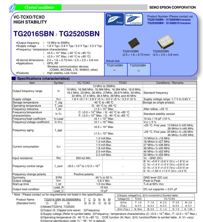 采购:爱普生晶振,温补晶振,TG2016SBN晶振,X1G0046910106晶振