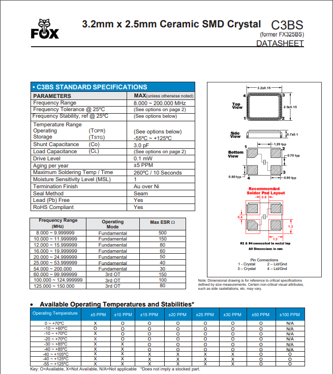 FOX晶振,贴片晶振,C3BS晶振,F-C3BS-B-B-G-M-25.0晶振