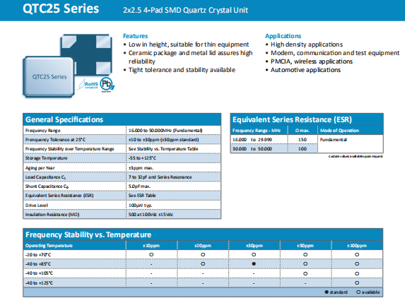 QuartzChnik晶体,进口2520晶振,QTC25晶振.小型表面贴片晶振型,是标准的石英晶体谐振器,适用于宽温范围的电子数码产品,家电电器及MP3,MP4,播放器,单片机等领域.可对应16.000MHz以上的频率,在电子数码产品,以及家电相关电器领域里面发挥优良的电气特性,满足无铅焊接的回流温度曲线要求.