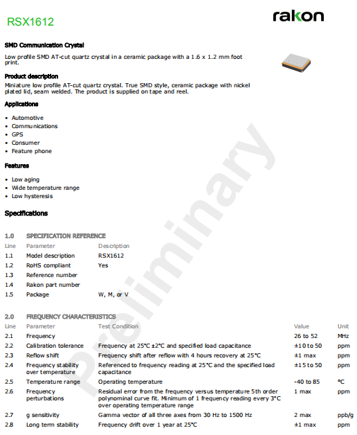 Rakon晶振,贴片晶振,RSX1612晶振,瑞康无源晶振.1612mm体积非常小的SMDcrystal器件,是民用小型无线数码产品的最佳选择,小体积的晶振被广泛应用到,手机蓝牙,GPS定位系统,无线通讯集,高精度和高频率的稳定性能,非常好的减少电磁干扰的影响,是民用无线数码产品最好的选择,符合RoHS/无铅.