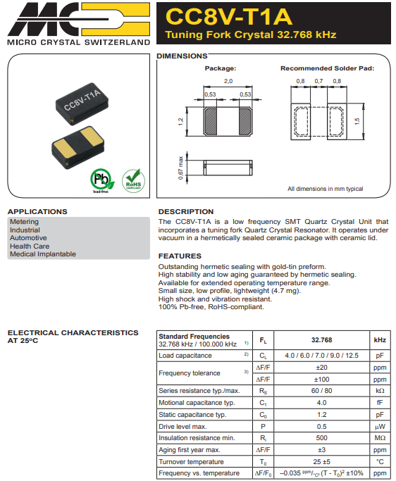 采购:微晶晶振,贴片晶振,CC8V-T1A晶振,CC8V-T1A-32.768kHz-12.5pF-20ppm-TA-QC晶振