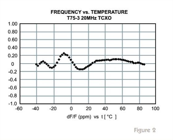 这使T75能够在-20至+70°C的温度范围内提供±0.2ppM的稳定性,在-40至+85°C的范围内提供。3ppM的稳定度,在-55至+90°C范围内提供+1ppM的平稳度。这些稳定性比通过使用热敏电阻补偿或三阶补偿获得的典型TCXO性能严格得多。最严格的稳定性选项的收益率没有那么高,因此选择更典型的稳定性(如±0.5ppM或±1.0ppM)具有成本优势。图2是补偿振荡器的频率与温度的关系示例