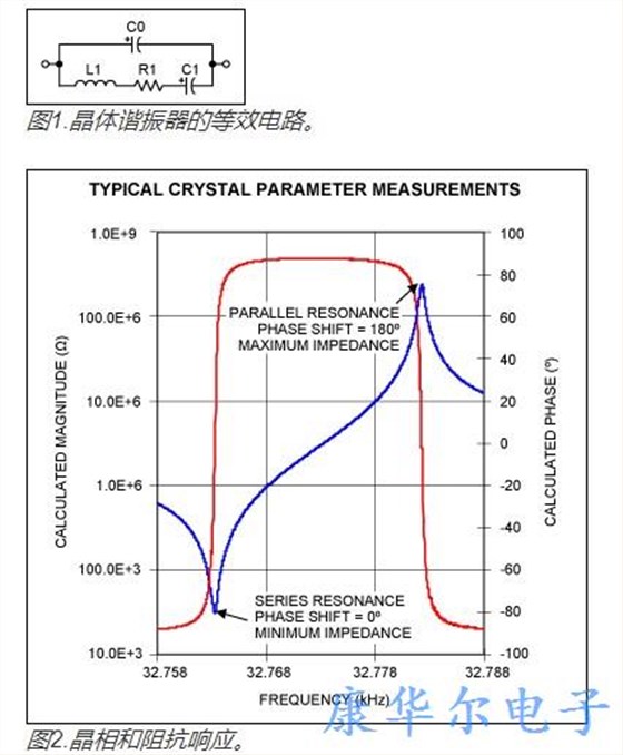 图1给出了晶体谐振器的等效电路.压电晶体具有两个零相位频率,如图2所示.较低的频率是串联谐振频率.在串联谐振频率下,L1和C1抵消,阻抗由R1确定.第二个更高的频率是并联谐振频率.在并联谐振时,电阻最大.