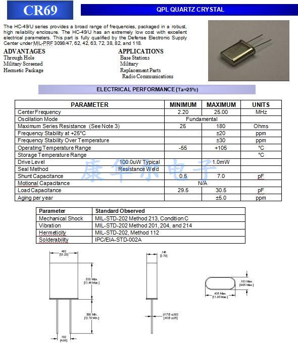 美国进口PDI晶振,CR69石英晶体,基站应用晶振