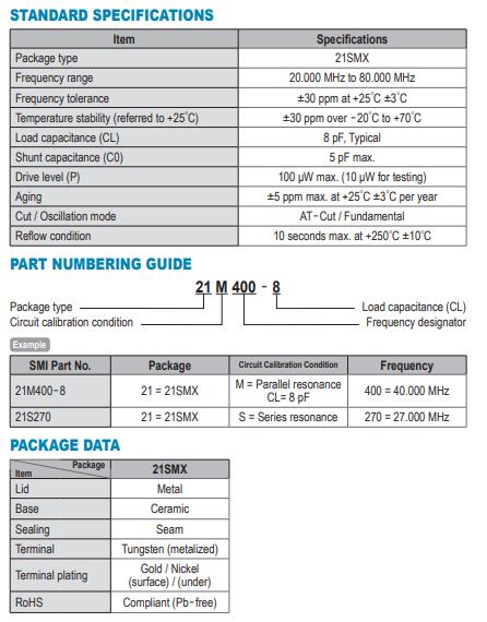 SMI晶振,贴片晶振,21SMX晶振,智能手机晶振.贴片石英晶体,体积小,焊接可采用自动贴片系统,产品本身小型,表面贴片晶振,特别适用于有小型化要求的电子数码产品市场领域,因产品小型,薄型优势,耐环境特性,包括耐高温,耐冲击性等,在移动通信领域得到了广泛的应用,晶振产品本身可发挥优良的电气特性,满足无铅焊接的高温回流温度曲线要求.